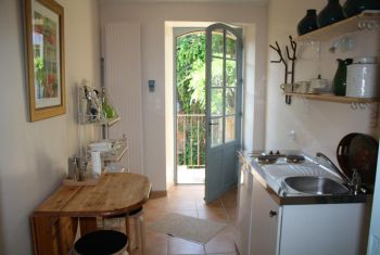 La cuisine jouit de deux portes-fenêtres vitrées, ouvrant respectivement sur le village coté rue, et sur la terrasse et jardin à l'arrière de la maison.