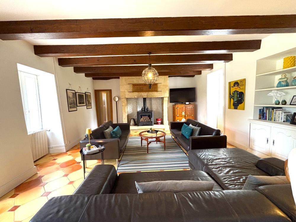 * En enfilade, le double salon offre un espace de vie de plus de 60m², avec son confortable coin salon, où canapés et fauteuils sont élégamment agencés autours de la belle cheminée en pierre, et son espace détente avec billard. Tv écran plat et Netflix sont disponibles.