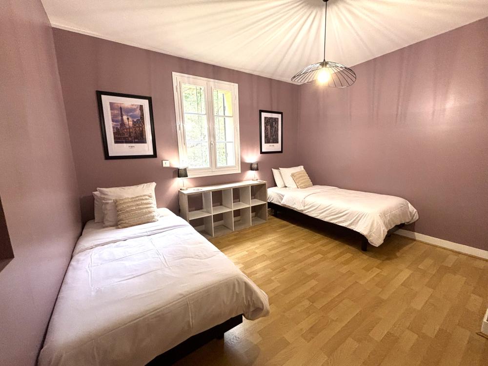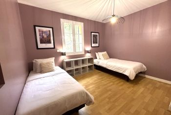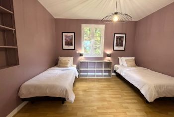 * le rez de chaussée se compose d'une chambre avec 2 lits simples, chevets et penderie, et salle d'eau en suite avec douche carrelée, toilettes et lavabo.