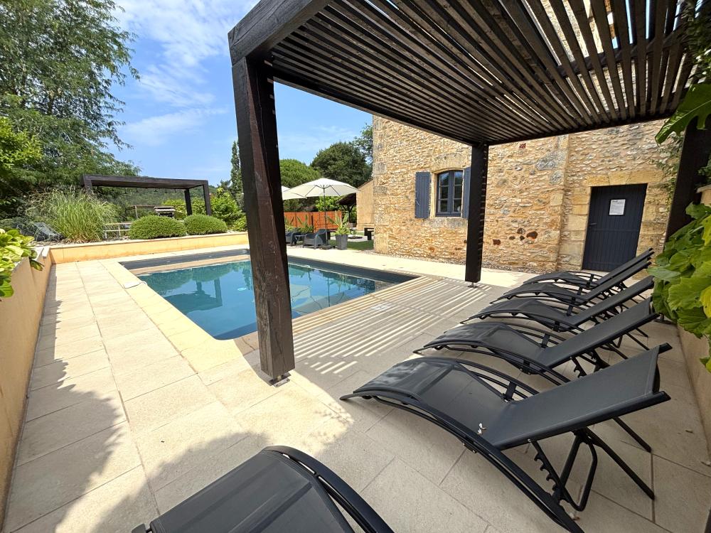 - La piscine privée de 8 m x 4 m et de 1,40m de profondeur, sécurisée par alarme immergée est ouverte de mai à septembre. Elle est équipée de bain de soleil