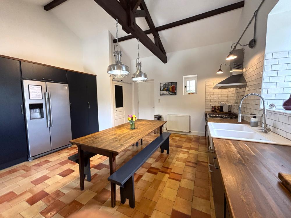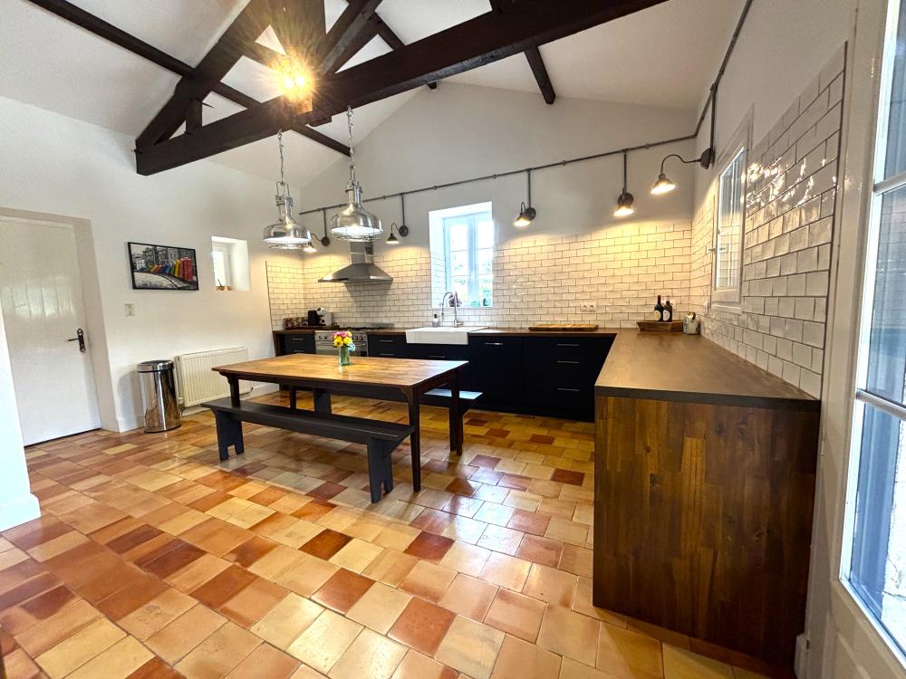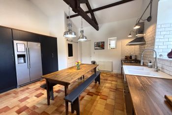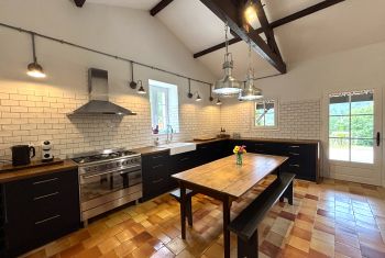 * Une superbe cuisine parfaitement équipée avec plaque induction, four, four micro-ondes, grand réfrigérateur-congélateur avec distributeur d'eau et de glaçons, et nombreux ustensiles de cuisine et de cuisson. Sa grande table en bois vous permettra de déjeuner en intérieur.