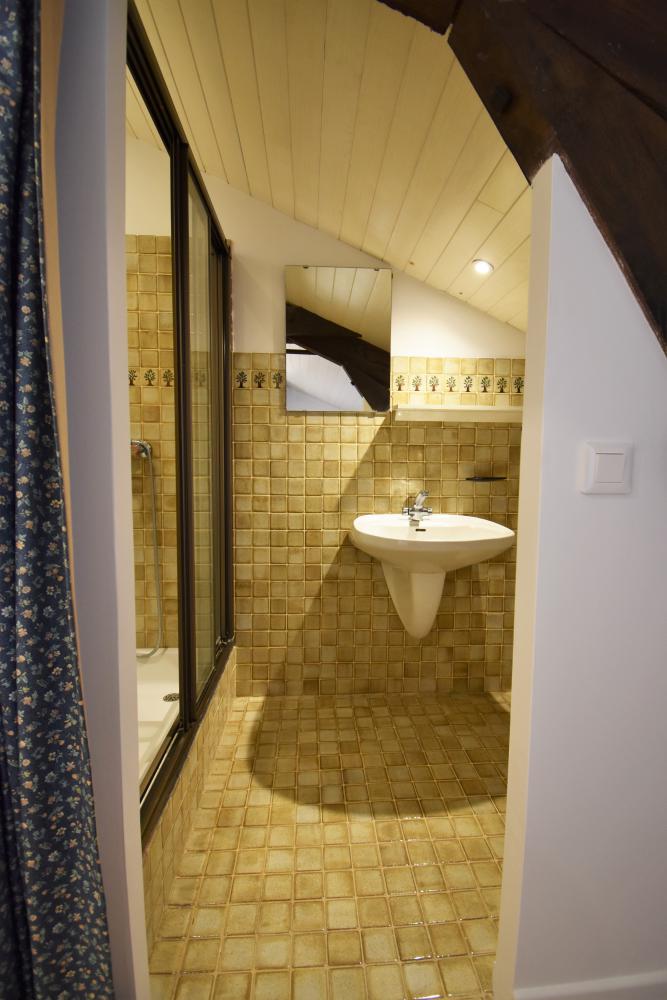 * Une salle d’eau avec meuble vasque, douche carrelée, et toilettes