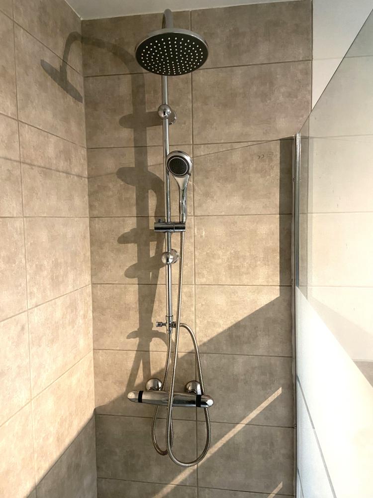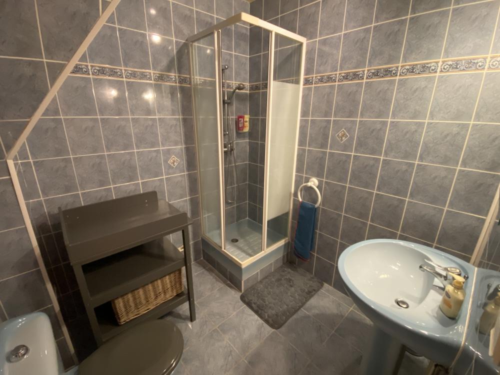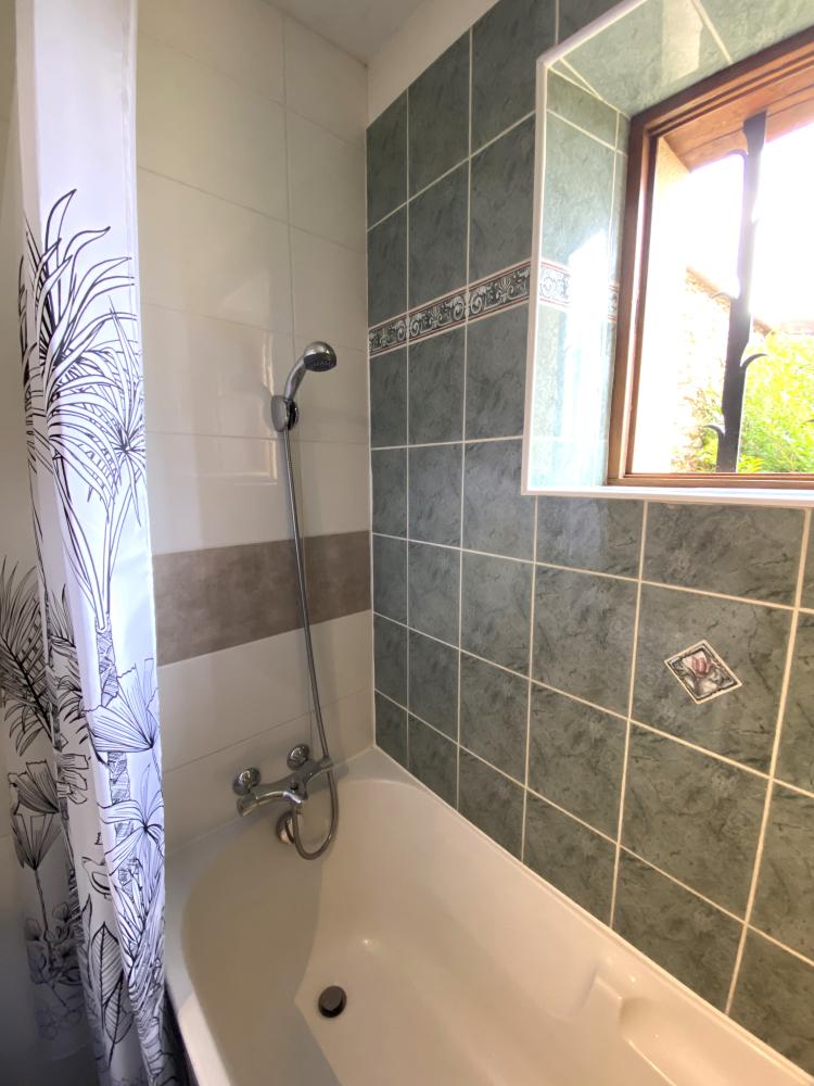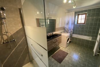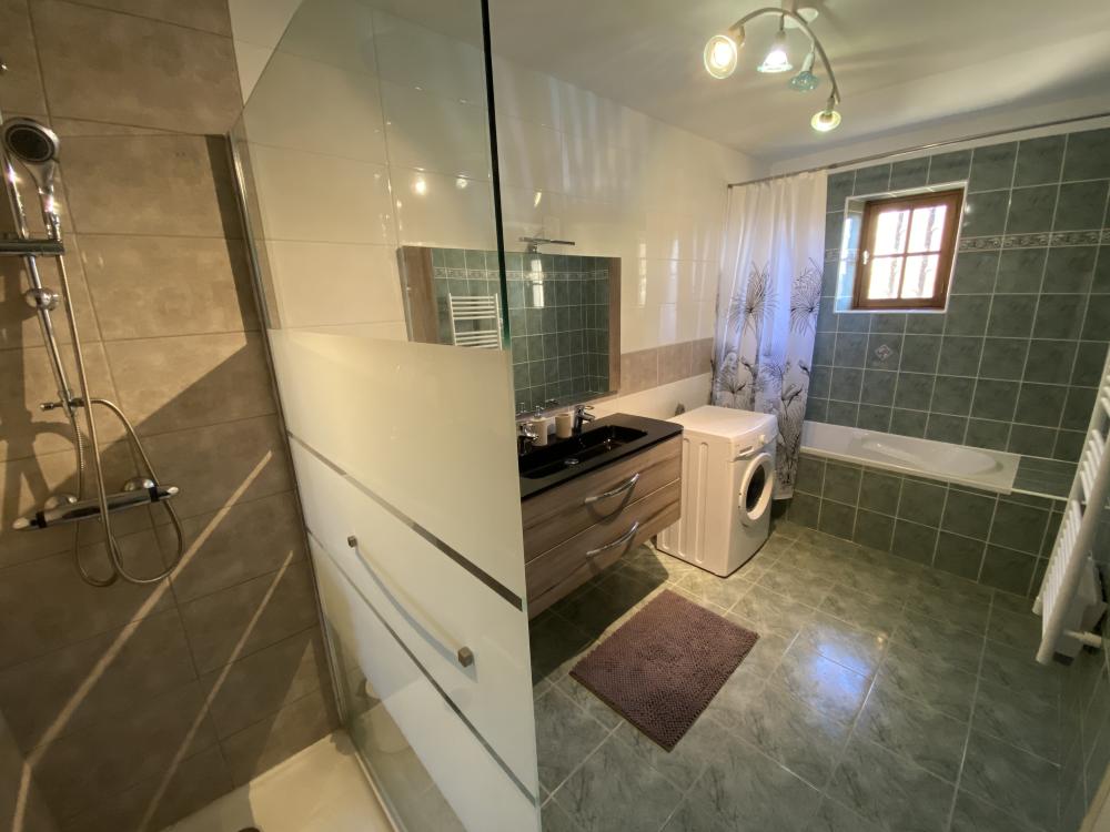 - une salle de bain spacieuse, avec douche, baignoire, meuble vasque et machine à laver