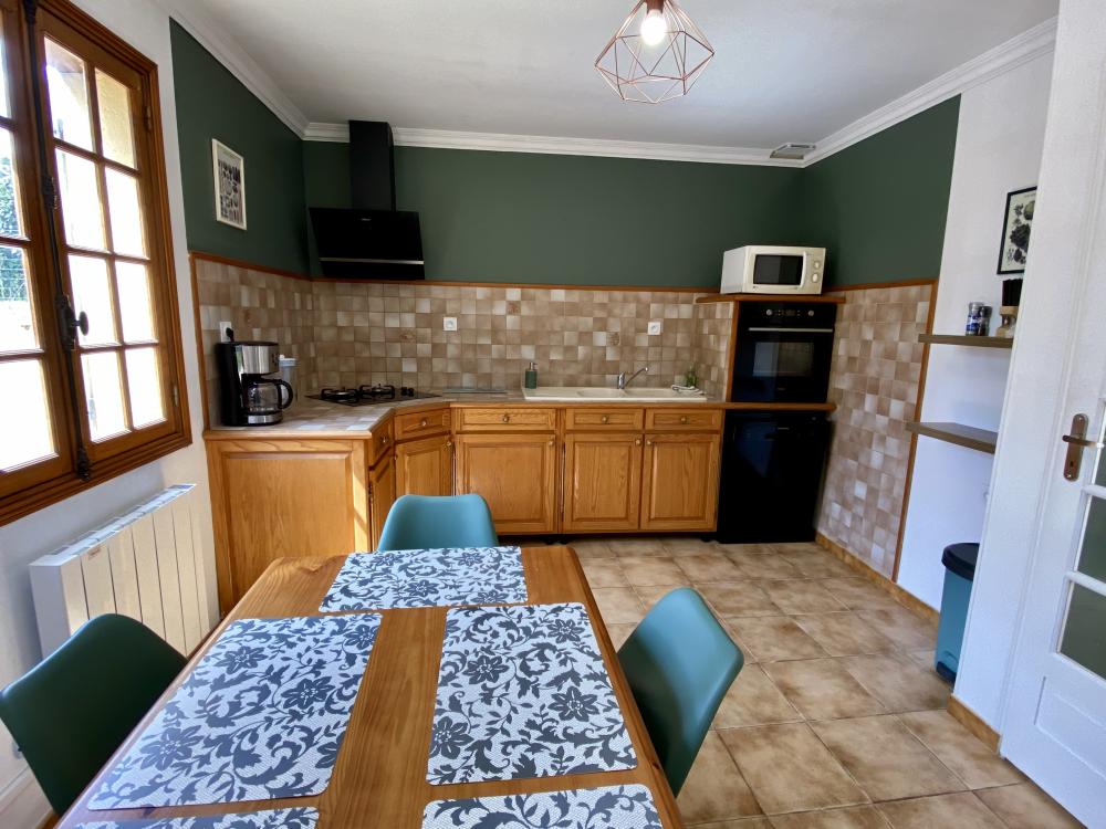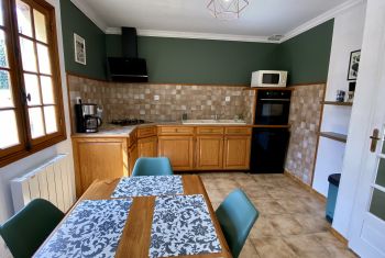 - une grande cuisine totalement équipée avec plaque de cuisson, four, frigo, micro ondes, cafetière, bouilloire, lave vaisselle.... une table et chaises, idéal pour le petit déjeuner.