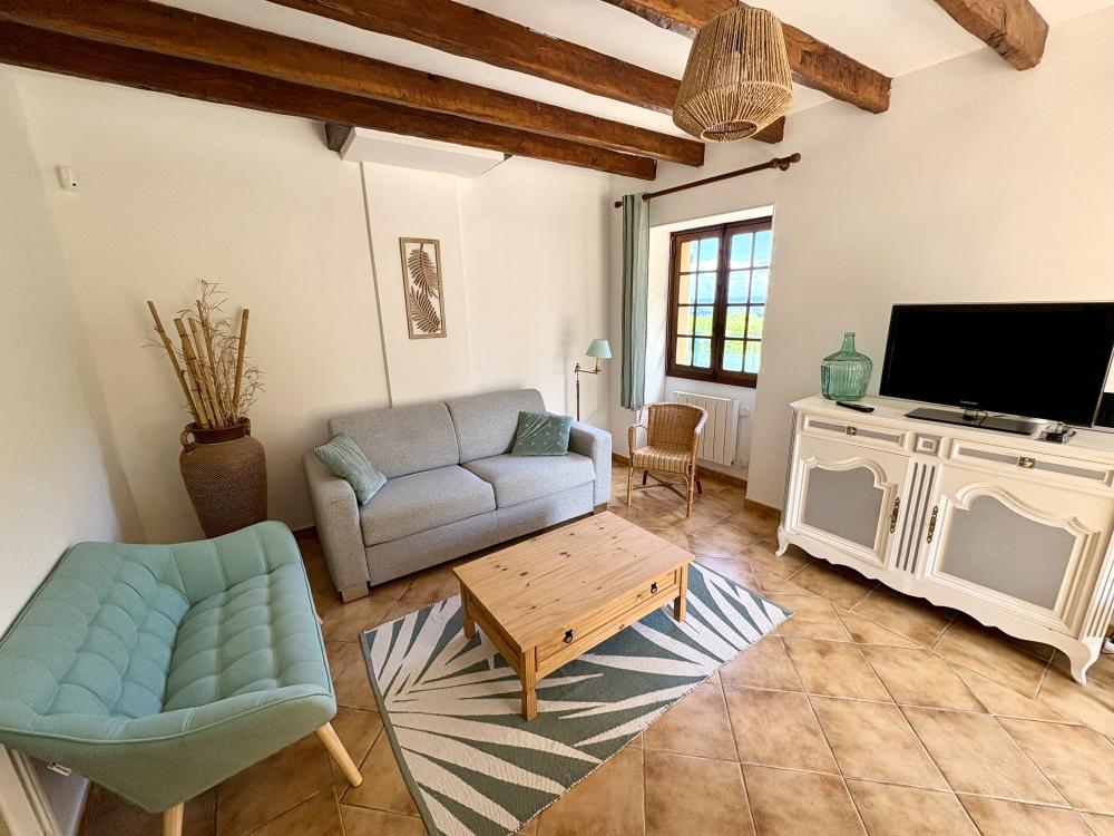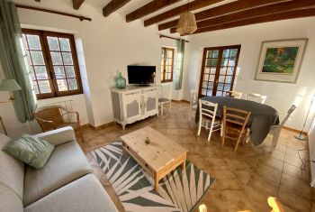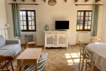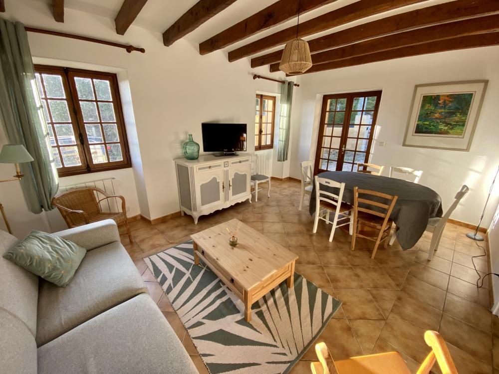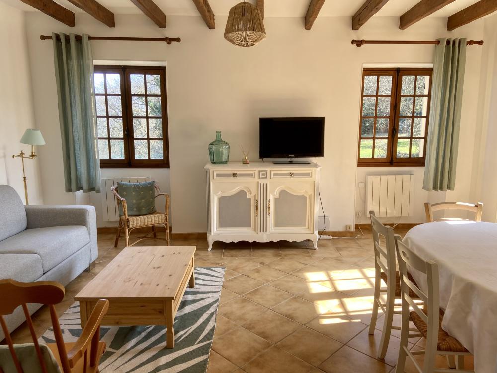 - une grande pièce à vivre avec canapés, fauteuil, TV écran plat, table basse et lampes, et un espace repas avec belle table en bois massif et 6 chaises.