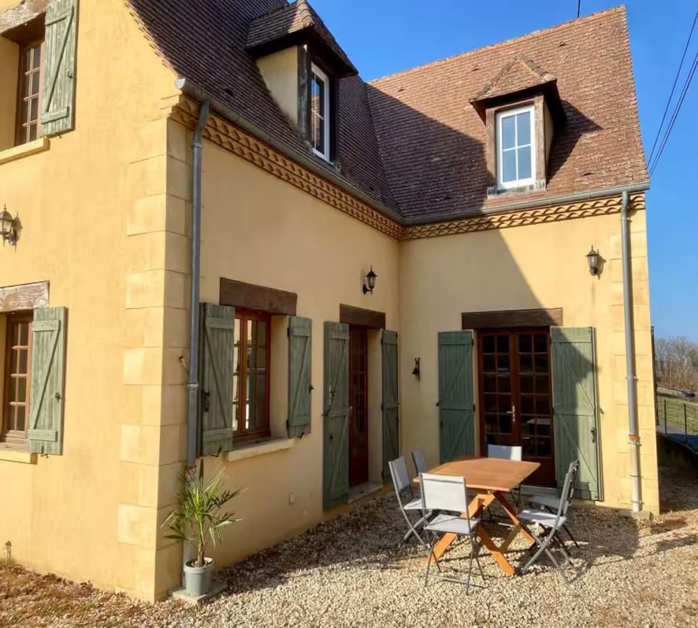 - Grande terrasse équipée d’une table et de 6 chaises de jardin, barbecue Weber au charbon et parasol vous permettant de déjeuner en extérieur