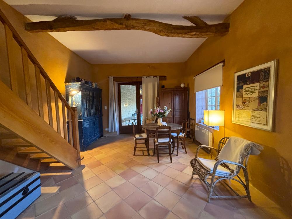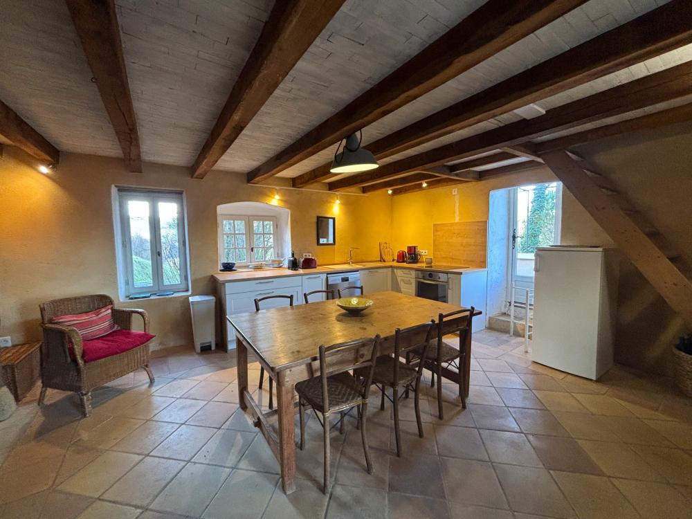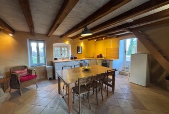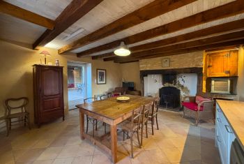 * La cuisine, avec son imposante cheminée cantou et joli ancien évier en pierre offre un espace repas pour 6 à 8 convives sur sa conviviale table carrée.