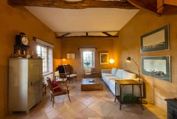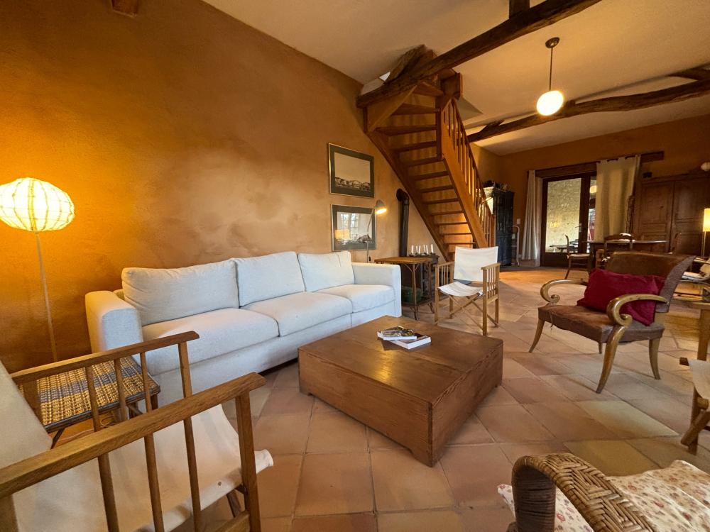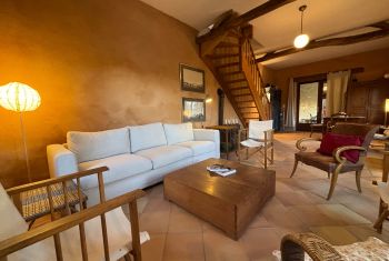 L'ancienne grange, réhaussée et agencée sur deux niveaux, offre de plain pied une très spacieuse et lumineuse pièce à vivre avec parquet, pierres et poutres apparentes.