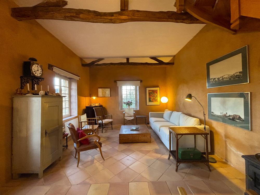Le confortable coin salon est équipé de 3 canapés et d'une table basse, élégamment agencés autours du petit poele à bois.