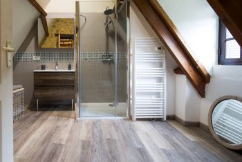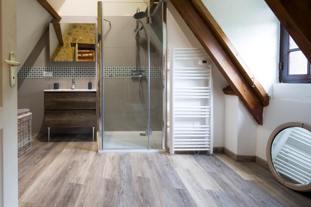 A l’étage : la chambre principale avec salle d’eau (douche, lavabo et toilettes) bénéficie d’une belle vue sur la vallée.