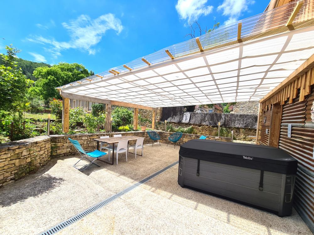 La grande terrasse couverte de 60m² vous garantie de longs moments de détente en extérieurs. Elle est équipée d'une table et chaises, vous permettant d'y déjeuner à l'ombre.