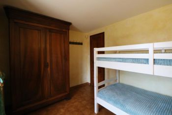 * D’une chambre enfant avec un lit superposé, une table de chevet, une grande armoire/penderie de rangement. Porte fenêtre ouvrant sur la terrasse.