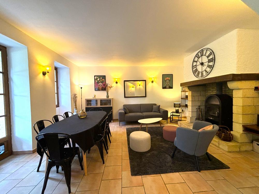 * Une spacieuse pièce à vivre baignée de lumière avec un confortable coin salon, élégamment meublé d'un canapé, fauteuils, table basse, TV écran plat, agencés autours du poêle à bois installé dans la grande cheminée.