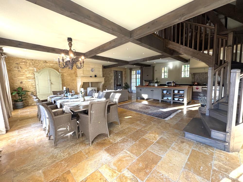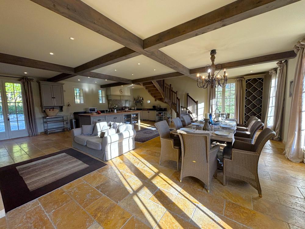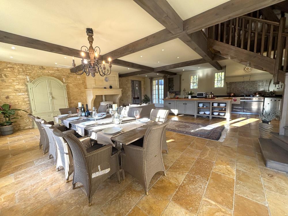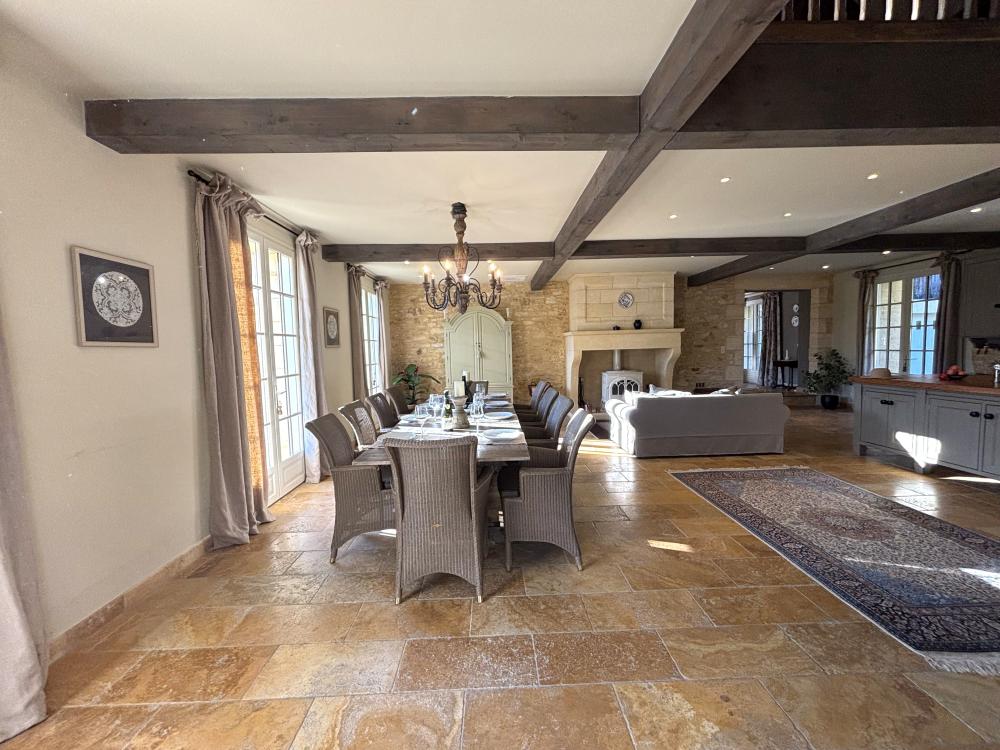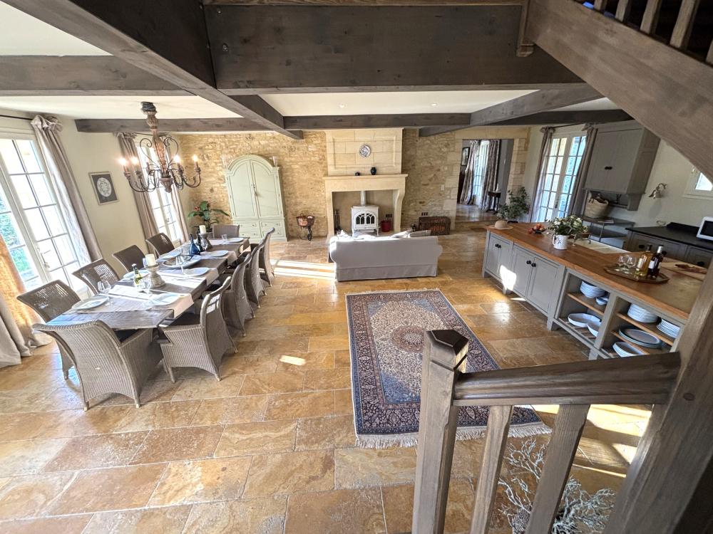 * Une splendide pièce à vivre de plus de 80m², avec cuisine parfaitement équipée, vaste îlot central et espace repas : assurément la pièce majeure de la maison où vous aimerez cuisiner les bons produits du Périgord et vous attabler tous ensemble pour de bons repas.