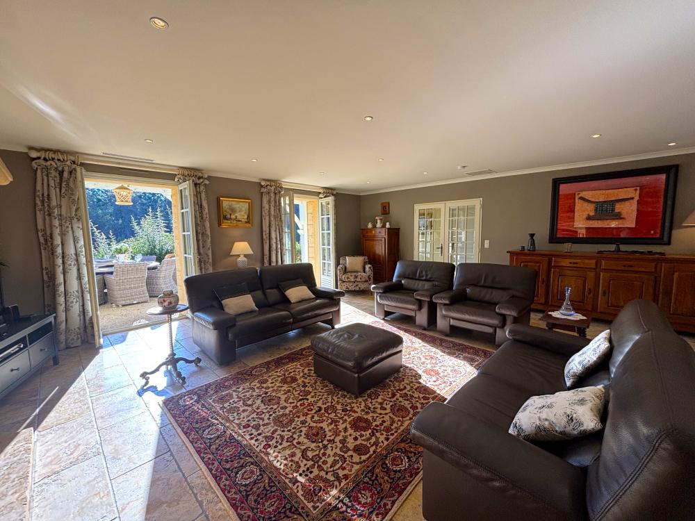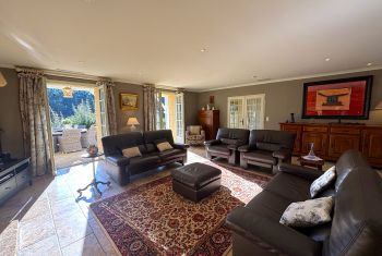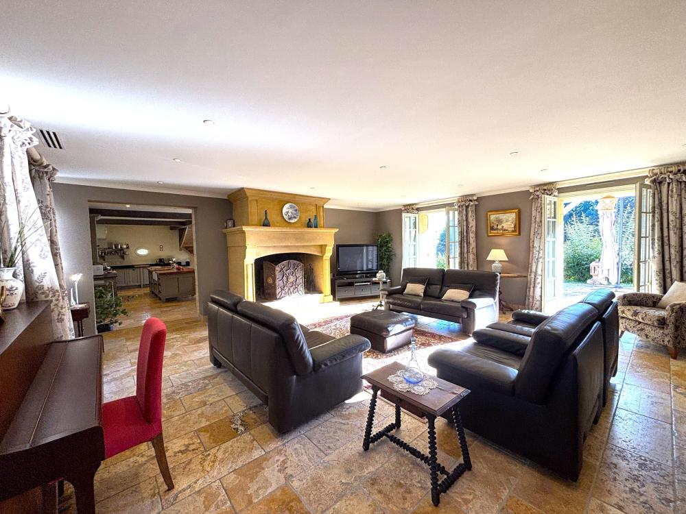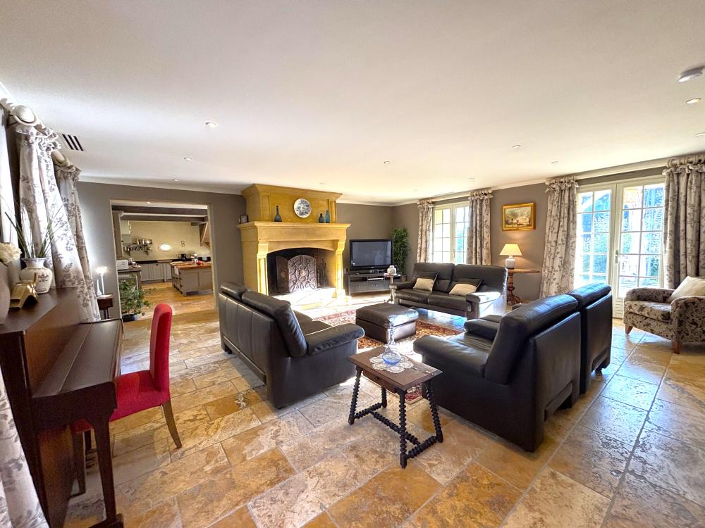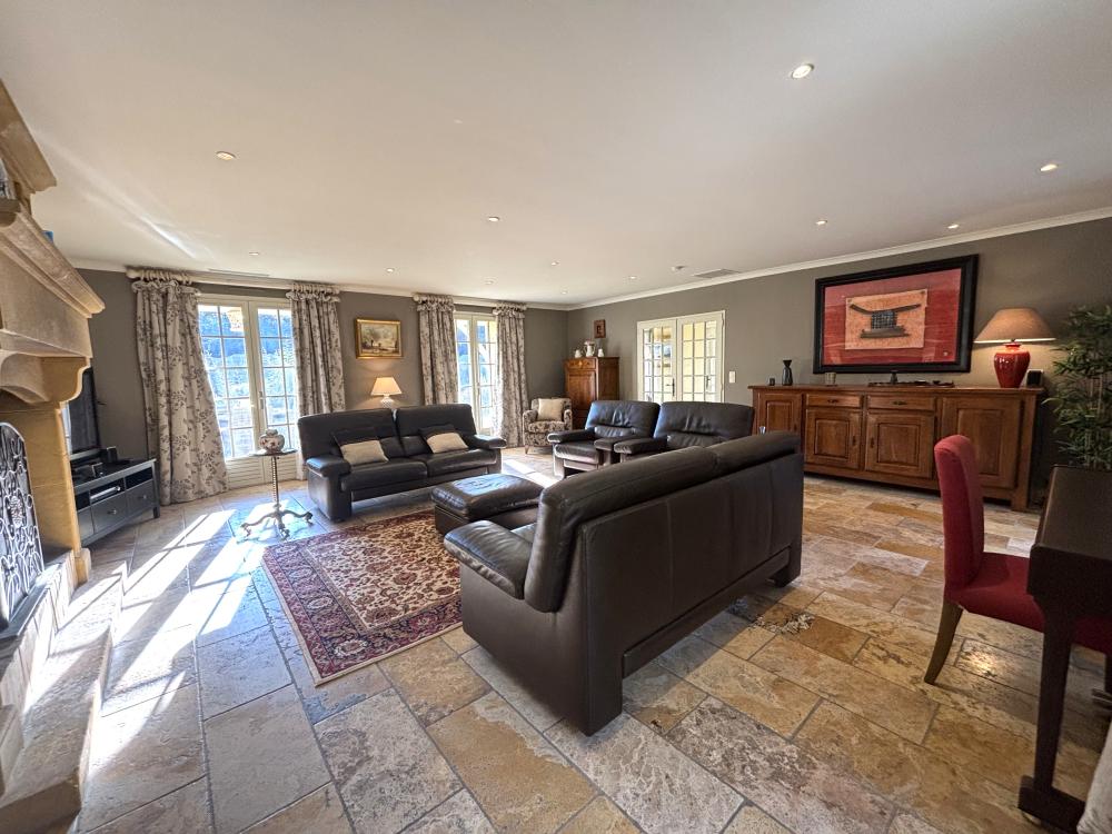 * Attenant, le superbe salon est élégamment meublé de deux confortables canapés en cuir, trois fauteuils, tapis et table basse agencés autours de la belle cheminée décorative en pierre. Une grande TV à écran plat, lecteur DVD et DVDtèque, et un piano complètent cet espace.