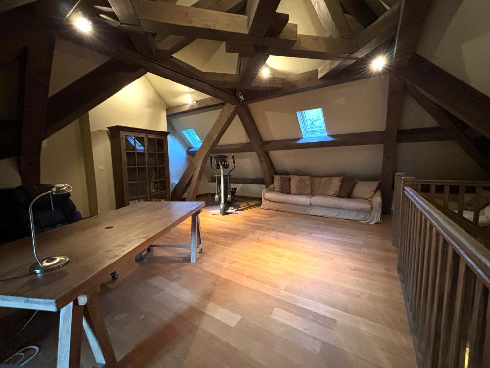 * La vaste pièce de 45m² accessible en mezzanine au dessus de la pièce de repas, avec sa magnifique charpente cathédrale, vous permettra de travailler sur le grand bureau en bois ou de vous reposer bien au calme confortablement lové dans le grand canapé.