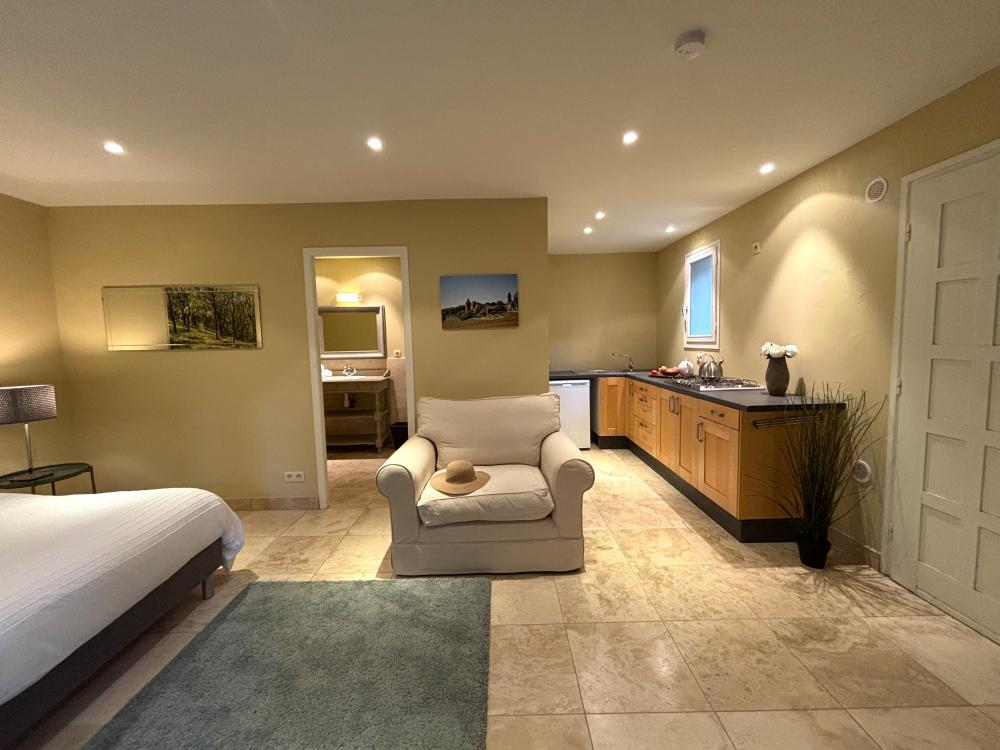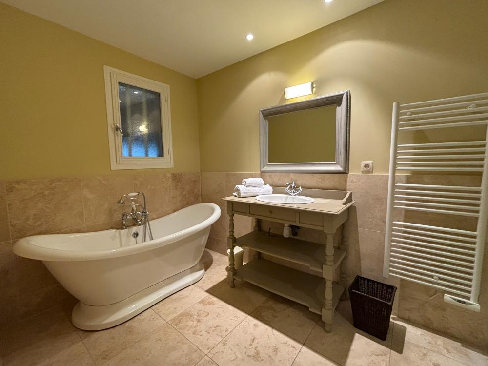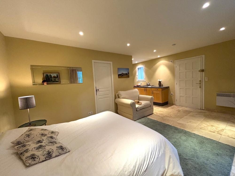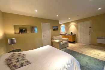 Située de l'autre côté de la cour d'entrée, LA MAISON D'AMIS offre avec sa kitchenette équipée, sa cinquième chambre double et sa superbe salle de bain avec baignoire style empire et douche carrelée, un hébergement parfaitement indépendant pour un couple souhaitant préserver son intimité.