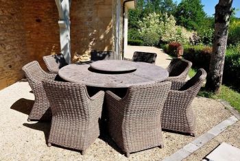 Toutes les pièces de la maison principale bénéficient de jolies portes-fenêtres s'ouvrant sur une longue terrasse partiellement couverte qui longe l'avant de la propriété et surplombe le jardin avec une vue imprenable, ce qui en fait un endroit idéal pour se détendre et profiter de la tranquillité de la campagne périgourdine.