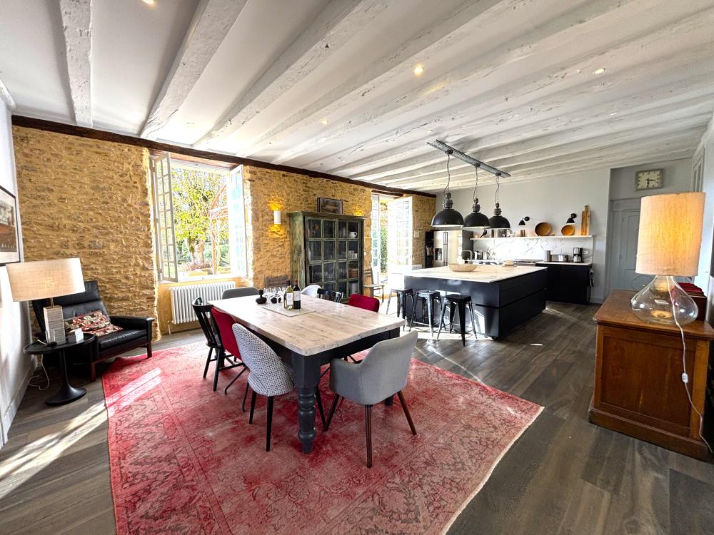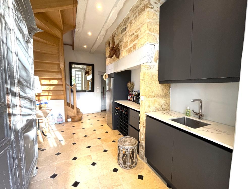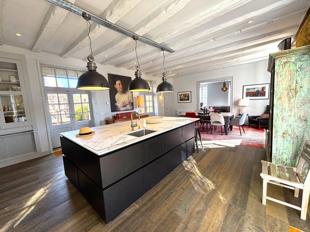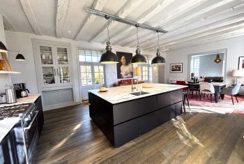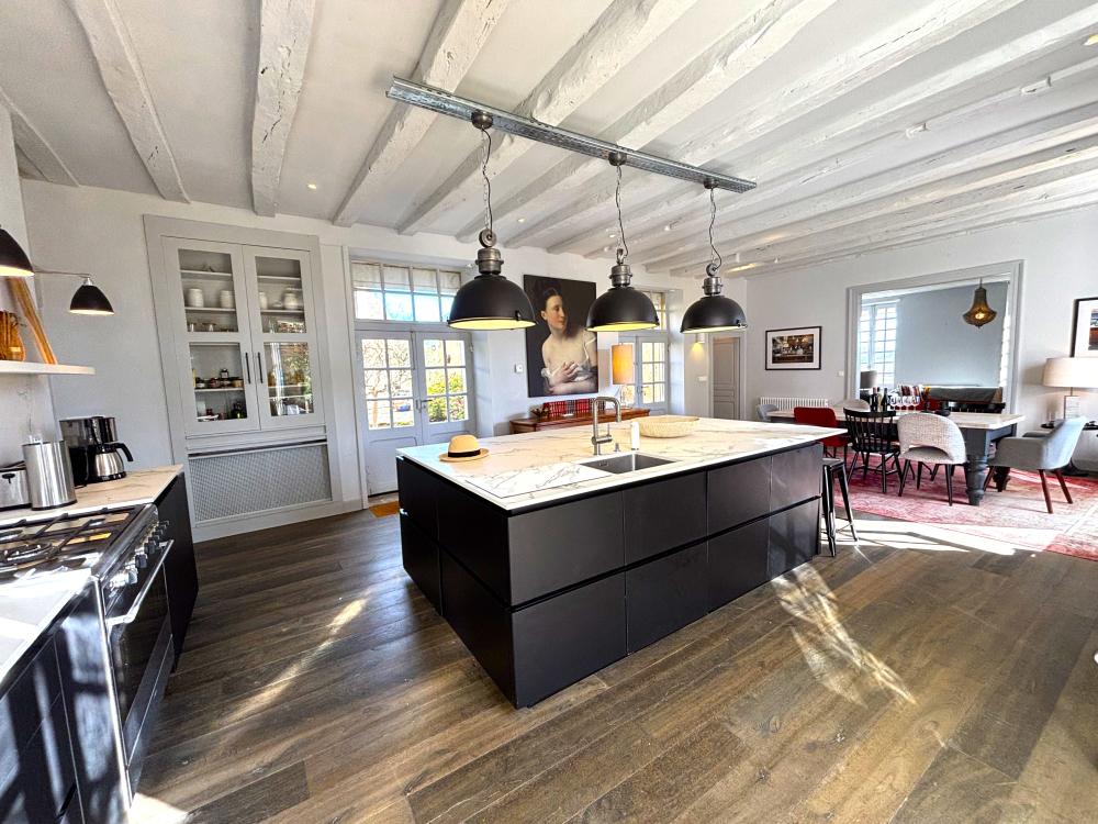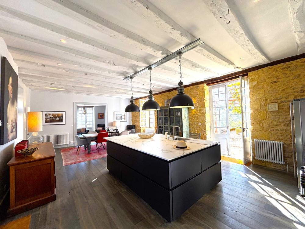 - La spacieuse cuisine est assurément le haut lieu d’heureuses retrouvailles entre amis ou en famille. Fruit d’un mariage réussi entre le charme de ses pierres et poutres apparentes, la chaleur de sa grande table en bois et de ses meubles patinés par le temps, et la modernité de son vaste îlot central offrant un équipement des plus modernes, elle vous permettra de préparer sur place tous les bons produits rapportés des nombreux marchés locaux alentours. La pièce est également largement ouverte sur la terrasse offrant une communication entre intérieurs et extérieurs idéale en été.