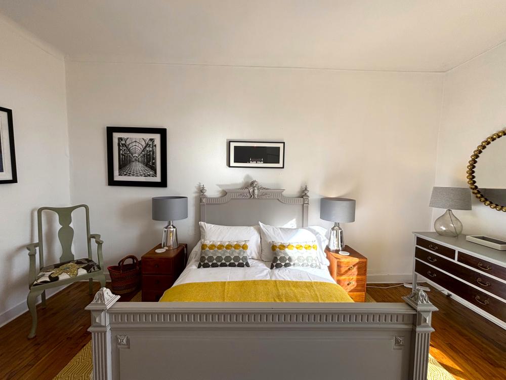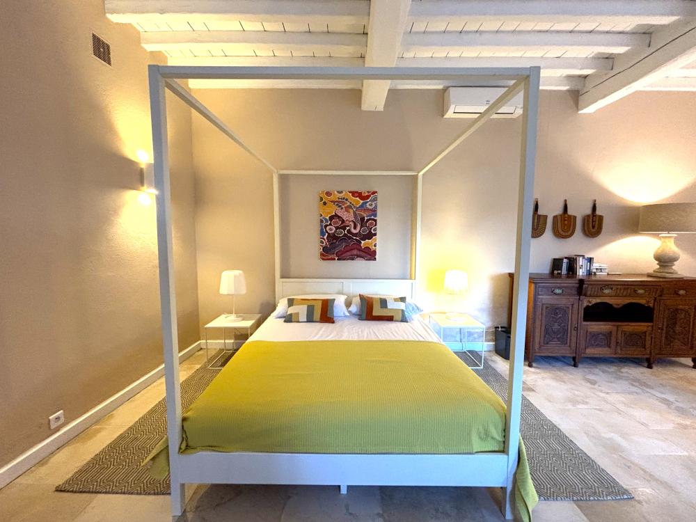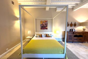 - un grand espace meublé d'un lit double à baldaquin en 160cm de large, de deux chevets, d'une penderie de rangement et d'un meuble à tiroirs