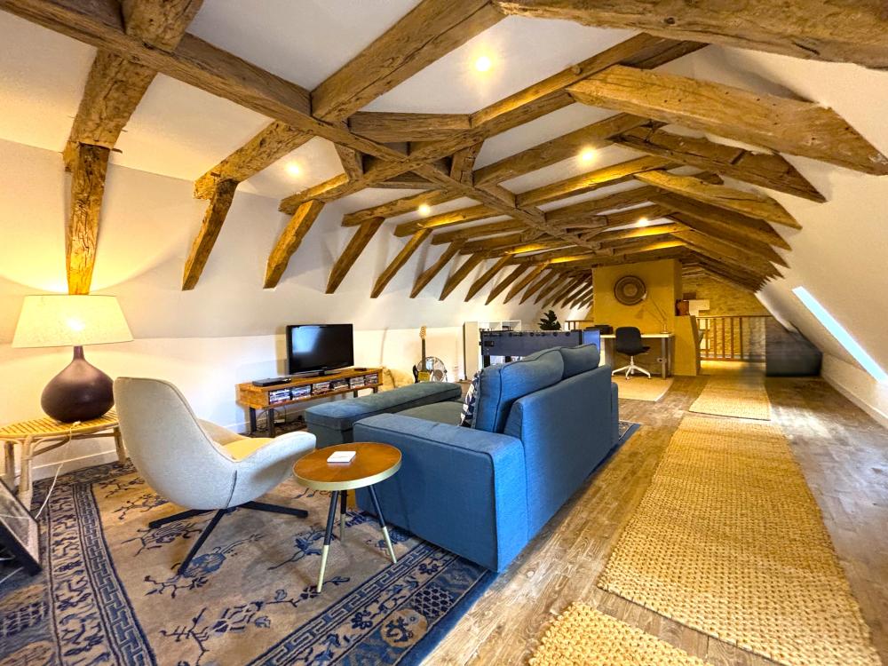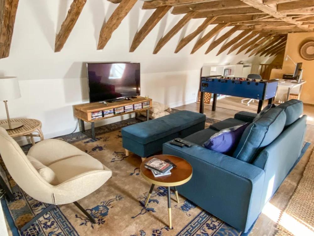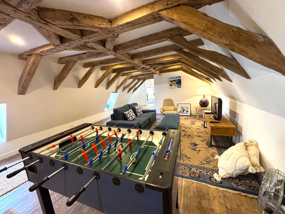 - La vaste pièce à vivre offre au choix un second salon TV, une salle de jeu avec baby-foot ou un espace travail avec bureau et siège.