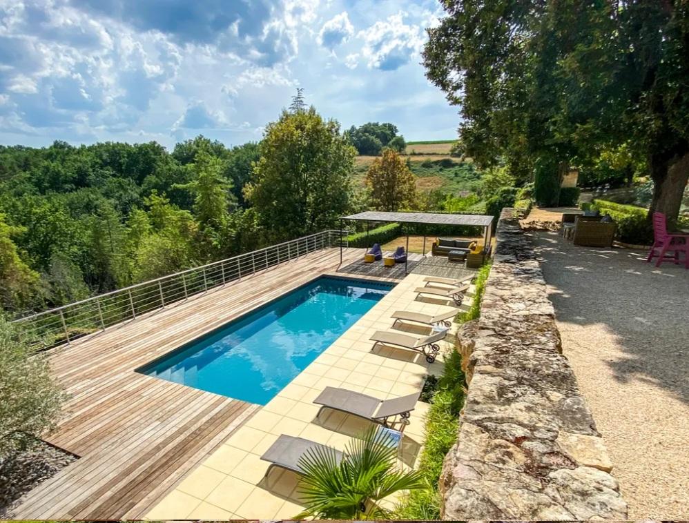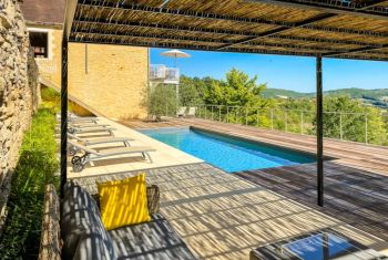 Le muret en pierre séparant la terrasse principale de la piscine en contrebas étant assez bas, notez que la propriété n'est pas adaptée à de trop jeunes enfants.