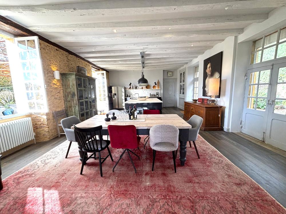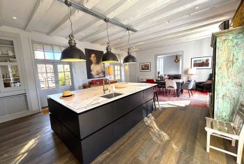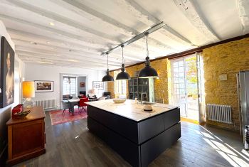 - La spacieuse cuisine est assurément le haut lieu d’heureuses retrouvailles entre amis ou en famille. Fruit d’un mariage réussi entre le charme de ses pierres et poutres apparentes, la chaleur de sa grande table en bois et de ses meubles patinés par le temps, et la modernité de son vaste îlot central offrant un équipement des plus modernes, elle vous permettra de préparer sur place tous les bons produits rapportés des nombreux marchés locaux alentours. La pièce est également largement ouverte sur la terrasse offrant une communication entre intérieurs et extérieurs idéale en été.