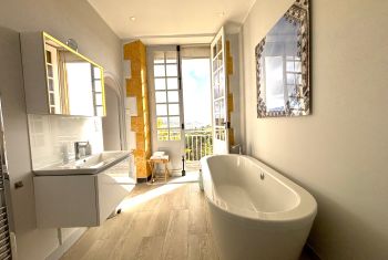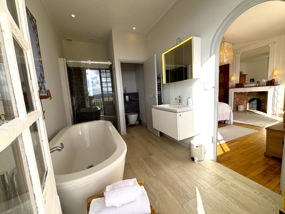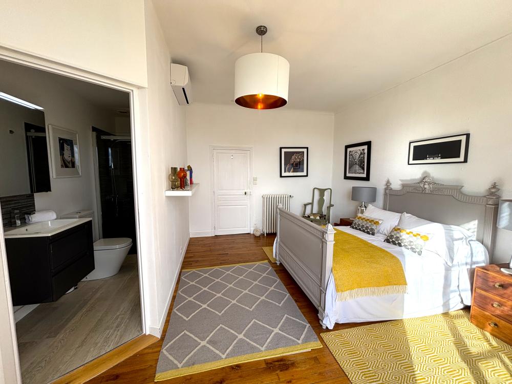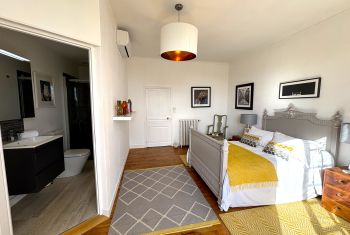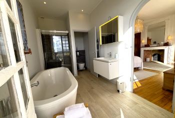 Elle bénéficie de la climatisation centrale et d'une salle de bain ensuite avec baignoire îlot, douche et meuble vasque.