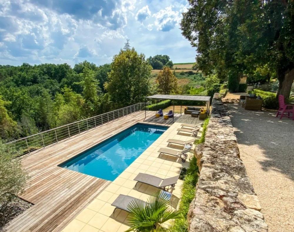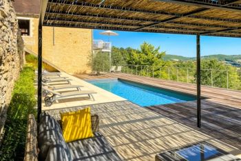Le muret en pierre séparant la terrasse principale de la piscine en contrebas étant assez bas, notez que la propriété n'est pas adaptée à de trop jeunes enfants.
