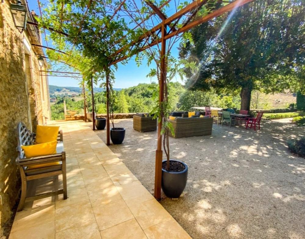 - La superbe terrasse, surplombant la piscine, vous permettra de déjeuner en extérieur à l'ombre du grand tilleul, ou de partager un apéritif confortablement installés dans le salon de jardin.