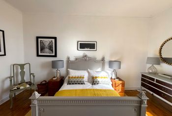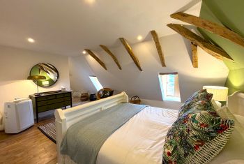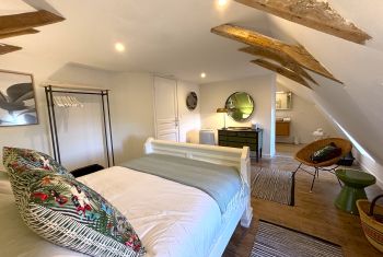 - la première suite offre un grand lit double en 180cm de large, deux chevets, deux fauteuils en rotin, une armoire, un meuble penderie.