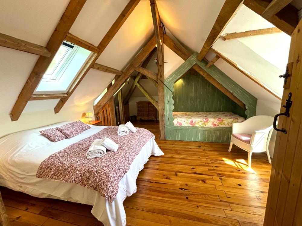 - La Chambre Bleue offre également un lit double en 160cm, deux lampes et tables de chevets, une armoire en merisier.