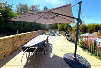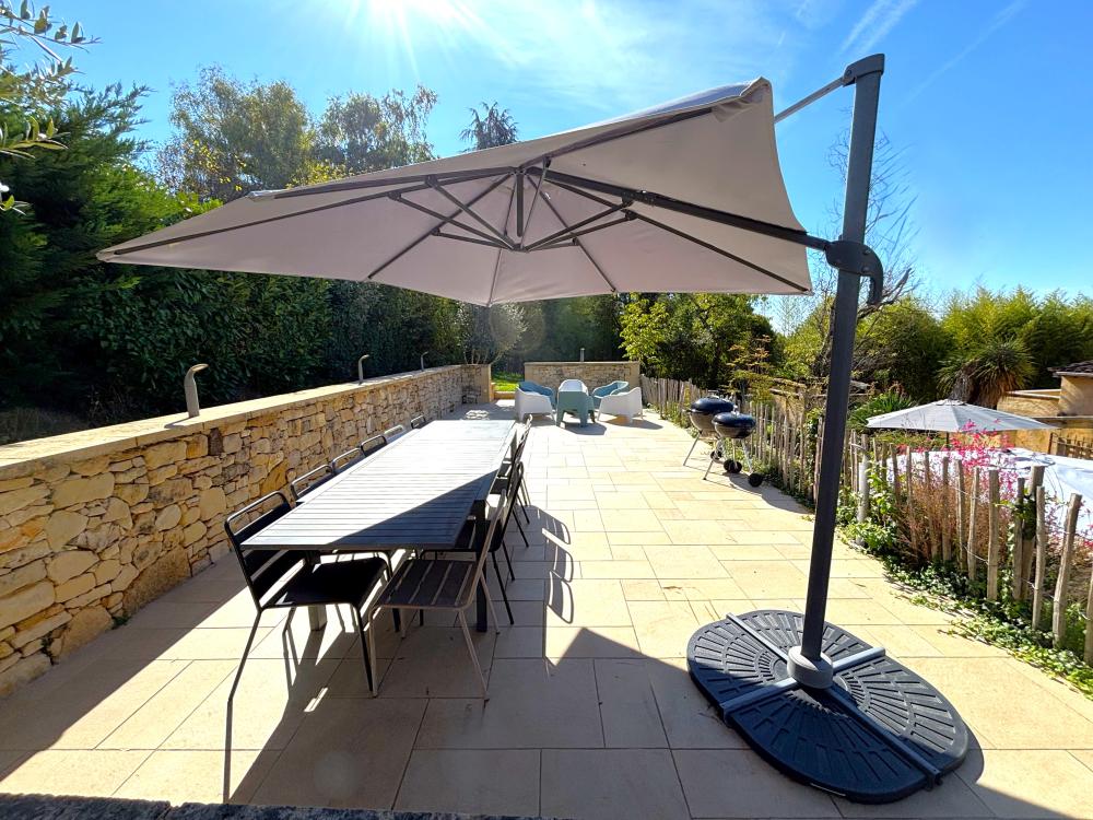 * La propriété offre de multiples terrasses, au niveau de chaque maison, et une une grade terrasse commune surplombant la piscine avec saon de jardin et grande table en fer. Vous pourrez y déjeuner en gardant un oeil sur les enfants en contrebas.