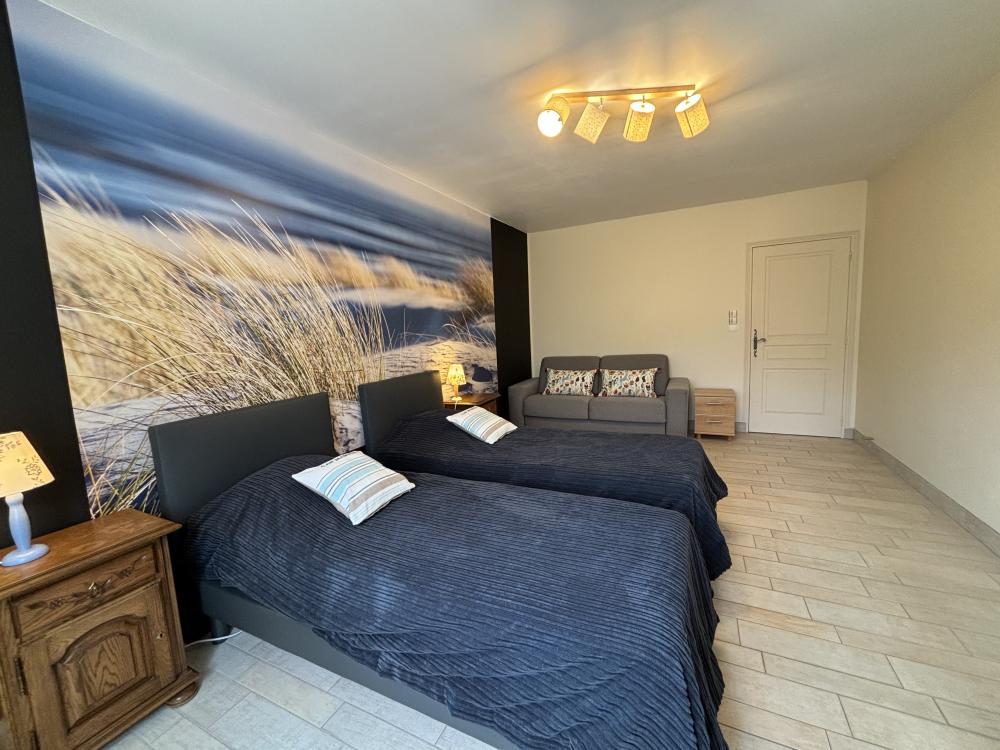 * Une première chambre avec deux lits simples, tables de chevet, et espace penderie. Le canapé lit offre davantage de flexibilité de couchage. Vue sur le jardin.