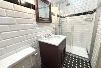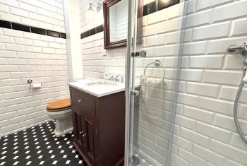 * Tout à côté, la grande salle de bain familiale, propose une douche à l'italienne, une baignoire sabot, un lavabo, et des toilettes.