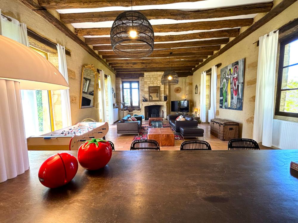 * une superbe pièce à vivre de plus de 60m² et de 5m de hauteur sous plafond, avec lumière traversante. L'espace salon est élégamment meublé de deux canapés, fauteuils et table basse, agencés autours de la magnifique cheminée en pierres de taille. Grand écran TV. La table design et son grand meuble bar vous invitent à partager d'heureux moments de convivialité.