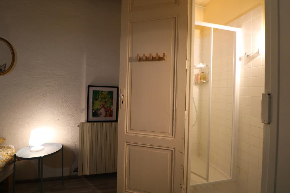 * Au centre de l'étage, la salle d'eau commune offre une douche à l'italienne en marbre et un meuble vasque.