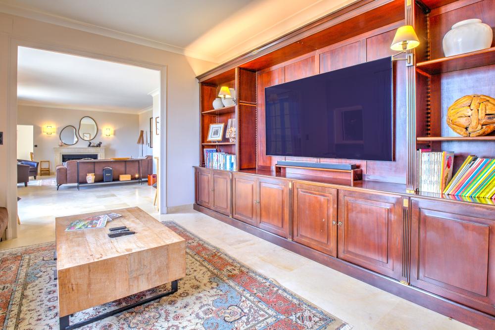 * Dans son prolongement, le salon bibliothèque plus intimise offre une TV connectée grand écran, un lecteur DVD, de nombreux jeux de société pour petits et grands, et de multiples ouvrages.
