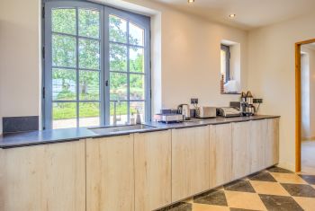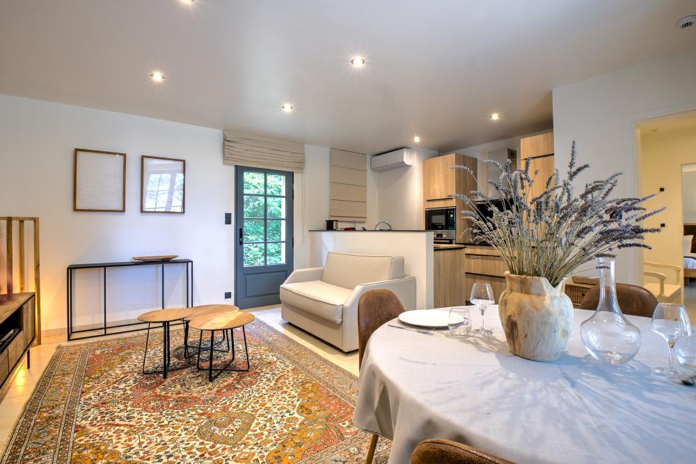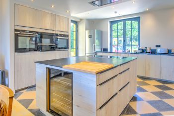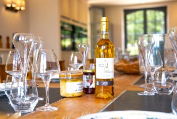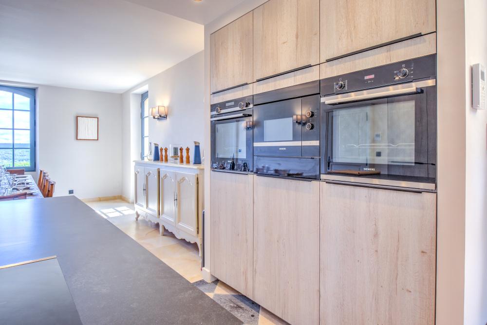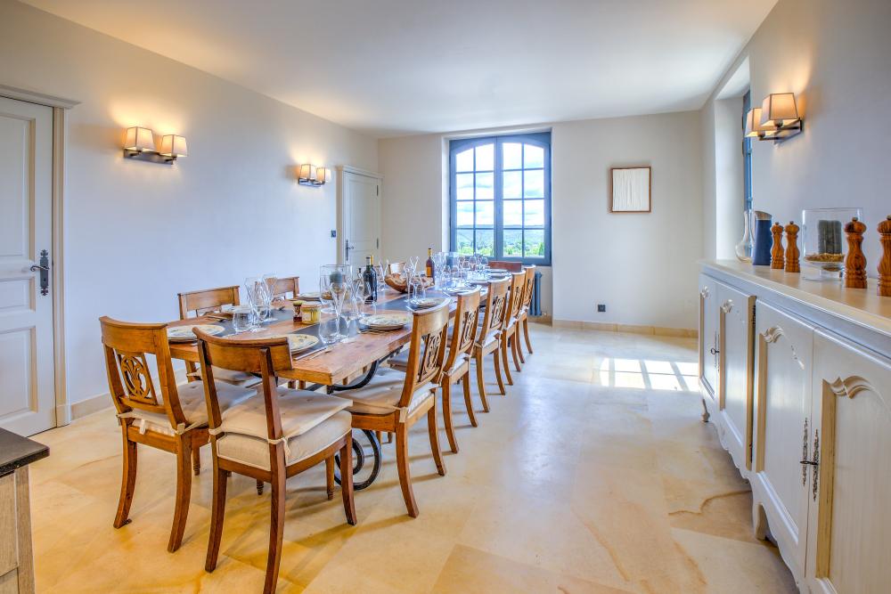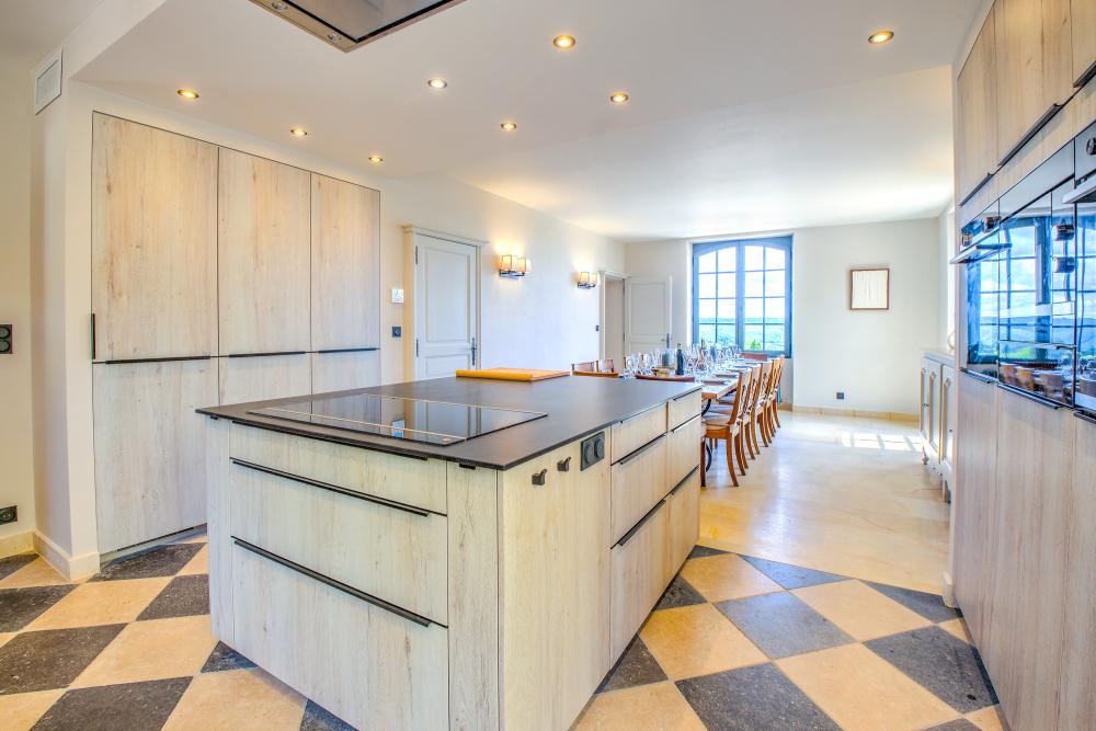 * A l'opposé du salon, la cuisine suréquipée comblera les cuisiniers les plus exigeants : plaque induction 6 feux, 2 fours dont un vapeur, 2 réfrigérateurs dont un avec distributeur de glaçons, robot ménager, mixeur, cave à vin, deux lave-vaisselle, vaisselle et ustensiles de cuisson en quantité généreuse... rien ne manque pour cuisiner les bons produits du Périgord rapportés des nombreux marchés alentours. La longue table en bois permet à 14 convives de déjeuner confortablement en intérieur.