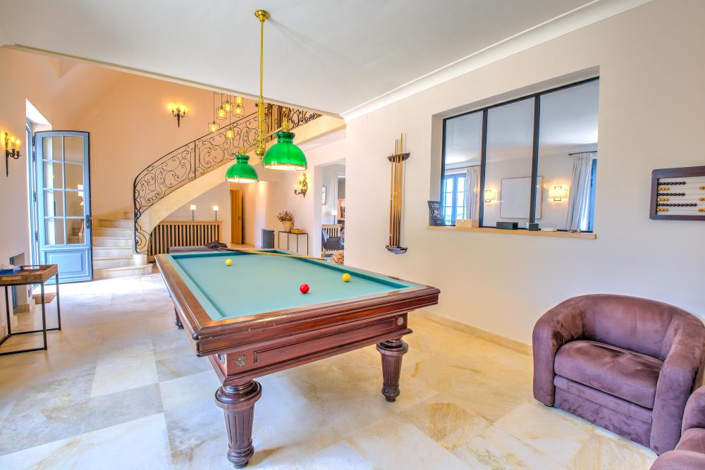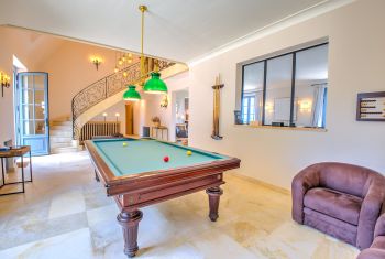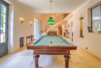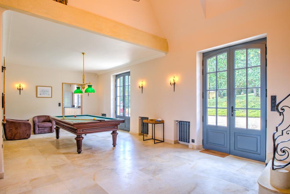 * Le majestueux hall d'entrée, offrant plus de 6m sous plafond, est équipé d'un billard. Il distribue les pièces de réception et l'escalier menant au premier étage.