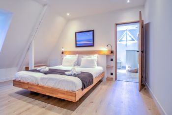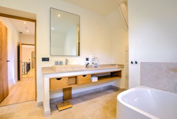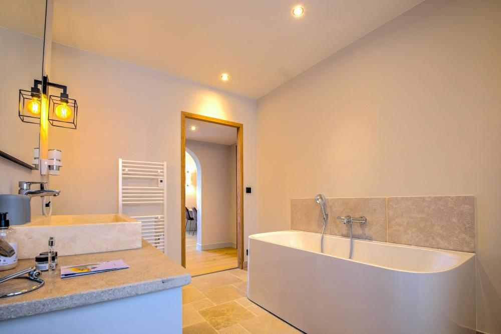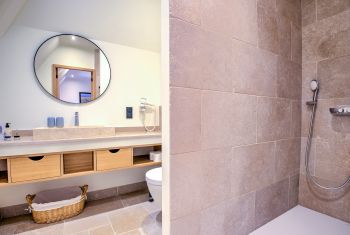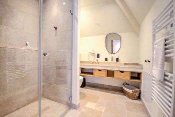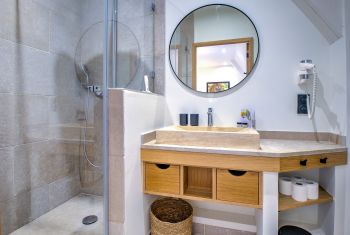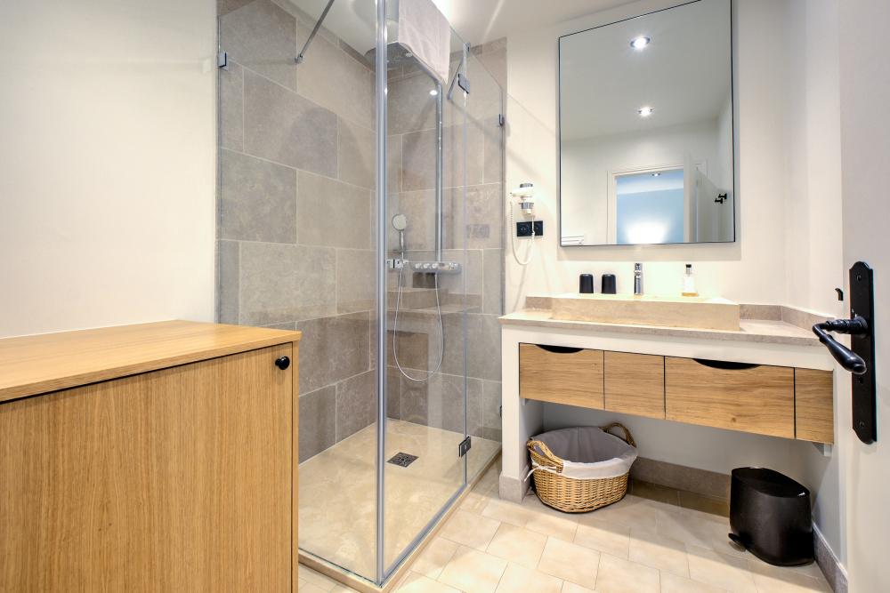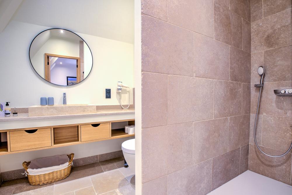 Chaque chambre bénéficie également de sa propre salle d’eau - avec douche italienne, meuble vasque et toilettes- ou salle de bain complète avec douche, baignoire, meuble vasque et toilettes.