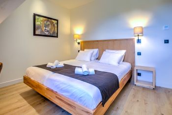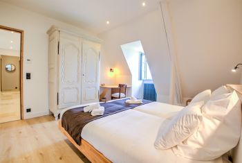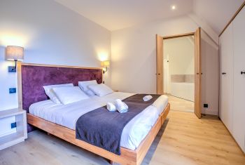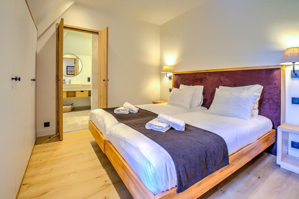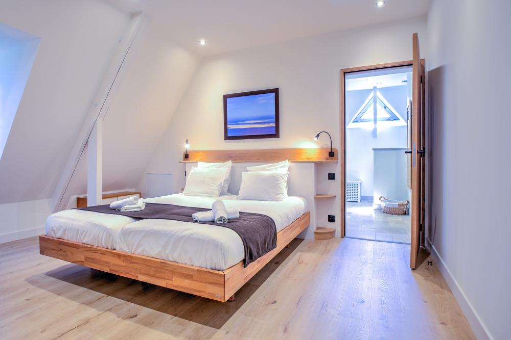 * La première chambre double se situe de l’autre côté de l’entrée, parfaitement au calme. Elle est élégamment meublée d’un grand lit double (180x200cm), d’un dressing et dispose d’une climatisation silencieuse.