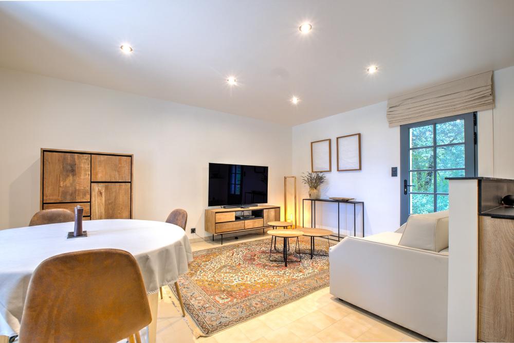 * Une belle pièce à vivre avec espace salon, également meublé d'un canapé-lit, table basse, TV grand écran et lecteur DVD, et une grande table ronde et 4 assises pour les repas