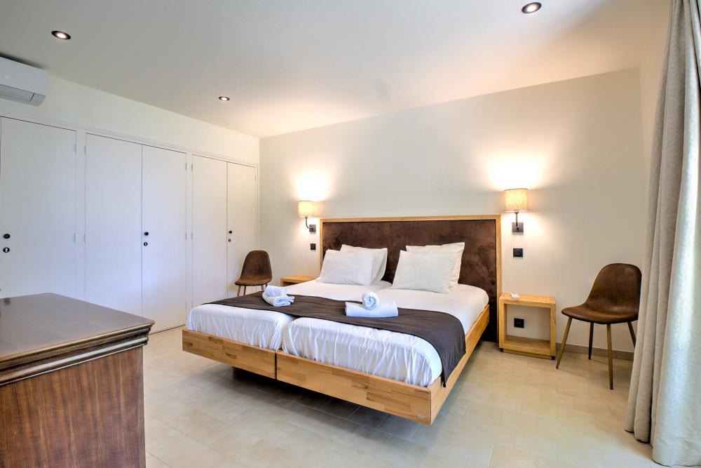 * Une vaste chambre climatisée avec deux lits simples en 90cmx200cm, pouvant là encore être joins en un grand lit double, chevets, bureau et multiples placards de rangement.