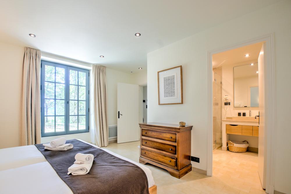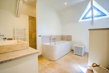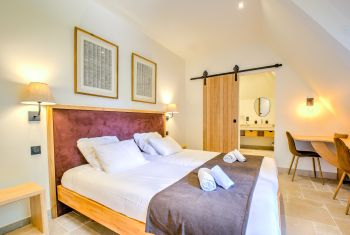 * Sa salle de bain en suite offre une baignoire, une grande douche à l’italienne et un lavabo. Des toilettes séparées complètent ce premier espace nuit privatif.